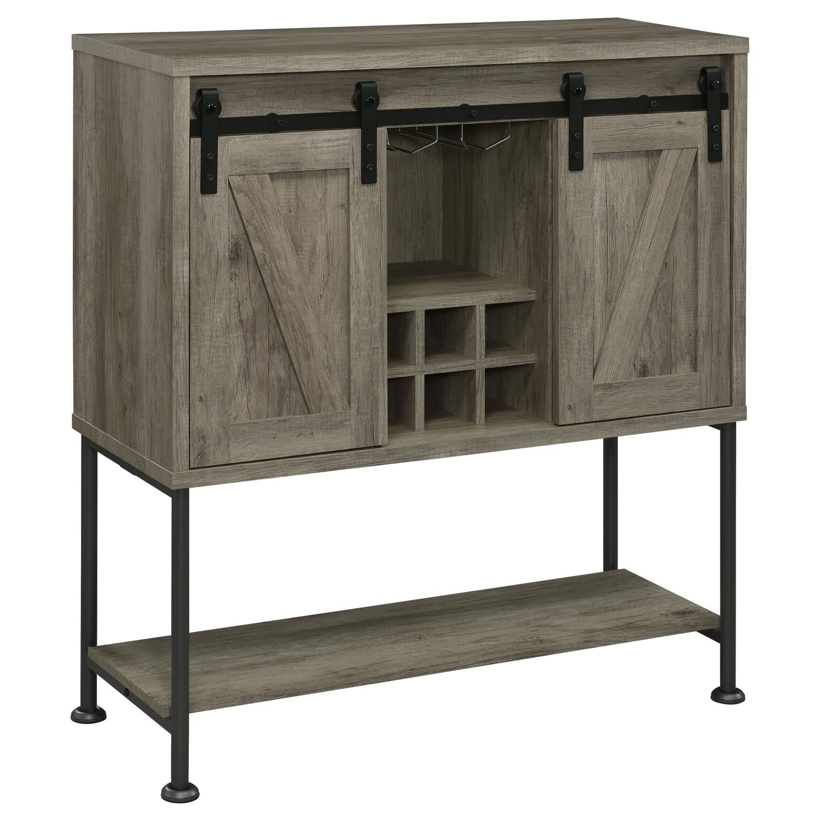 Perfect for a cottage or lakeside getaway, this bar cabinet features a light grey driftwood finish that is charming and cheerful. Place this bar cabinet in a rustic farmhouse home, as it offers country charm with two sliding barn doors that offer ample storage space. Crafted of a high pressure engineered veneer laminate, this bar cabinet is made to last for many years in the home. Plus, it offers one adjustable shelf behind each door. In addition, it has an open space to display favorite decanters and barware, along with a stemware rack mounted above and a six bottle wine storage.