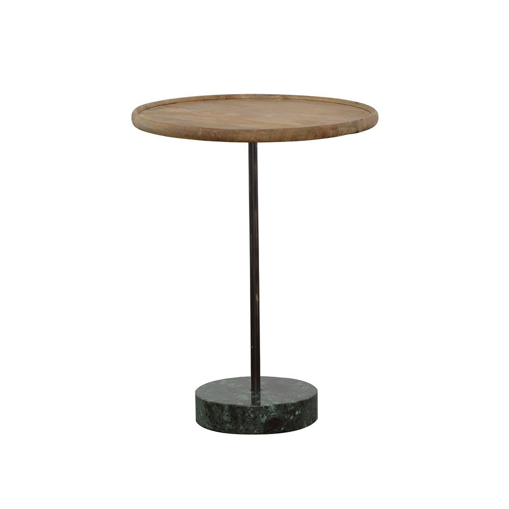 An assortment of striking materials combine to create this incredible accent table and its round mango wood tabletop creates the perfect spot for a house plant or flower vase. A contrasting green marble round base brings stability to this accent table. The entire piece is securely held together with a bold black metal frame. This marble, metal, and mango wood accent table brings an unexpected twist to your decor. Choose this piece for eclectic or rustic style decor themes.