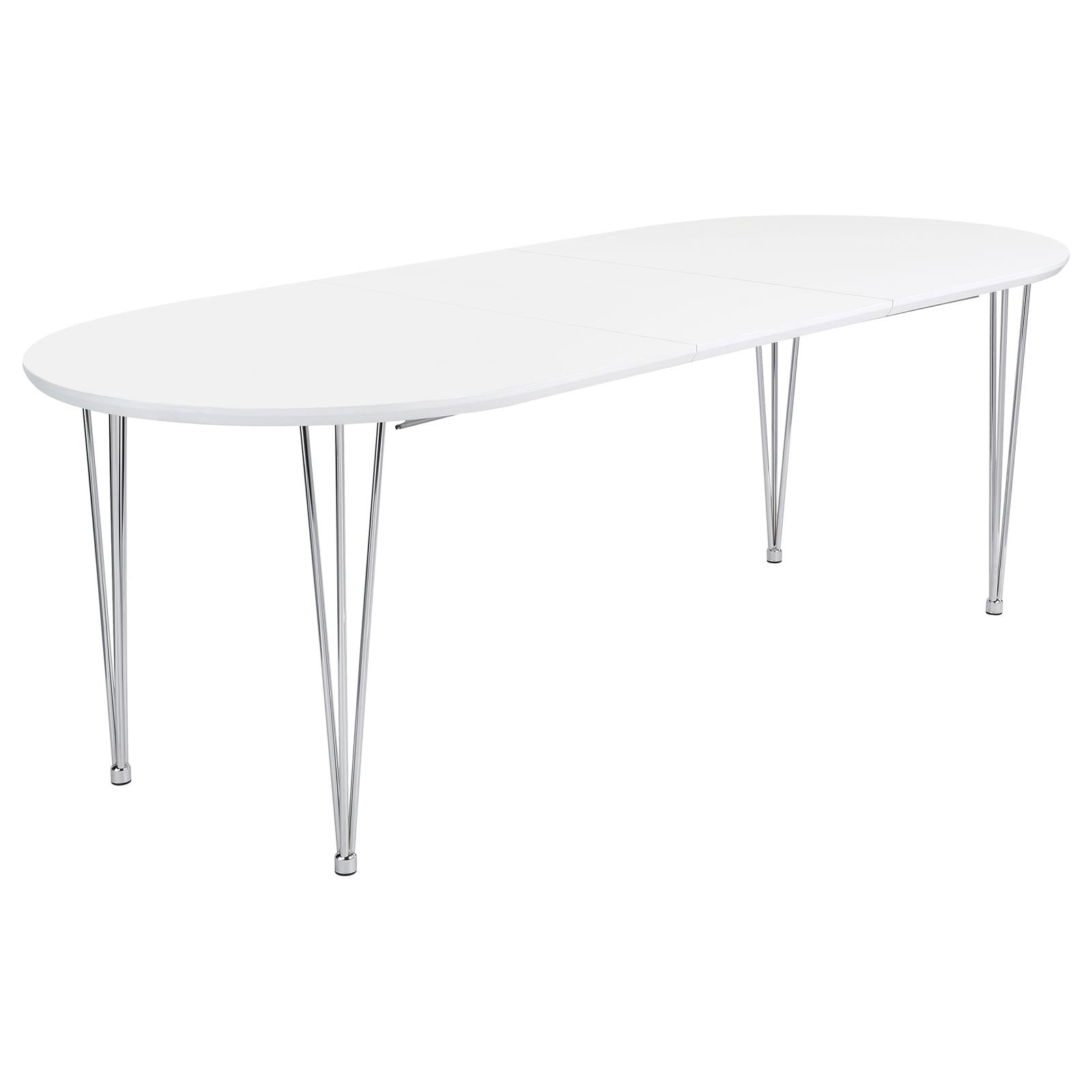 Elegant curved and sleek elements come together in this spacious modern dining table. Designed with hairpin metal legs in a shiny chrome finish, this table offers mid-century flair. Complete with a matte white tabletop, this table offers a bright and cheerful look. A rectangular shape capped by rounded ends offers a certain graceful aesthetic to the clean lines of this furniture piece. Entertain six guests comfortably or use this charming dining table as a casual family gathering place.