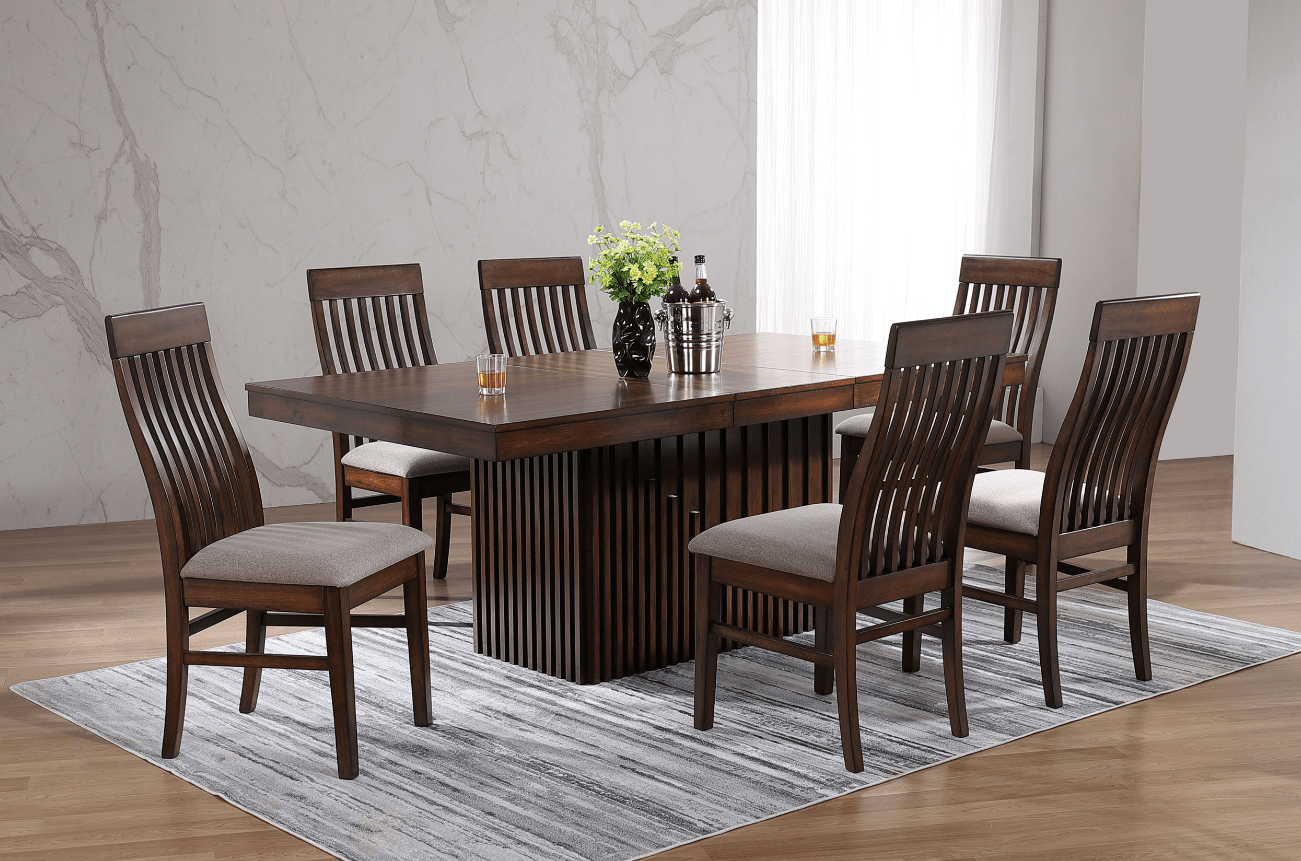 Imagine hosting family gatherings at the holidays and dining with friends around this charming, contemporary seven-piece dining set. Its modern look is established with a robust pedestal base complete with a decorative slat pattern. Its deep, rich mango oak wood grain finish is a lovely complement in casual and more formal spaces, and the table is equipped with an expansion leaf perfect for guests. Chairs are included, offering a padded seat with light brown upholstery, and a slatted back with a gentle curve for extra support and comfort. The set delivers a cohesive, artistic look and feel to center your dining space with both energy and soothing, welcoming ambiance.
